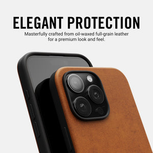 Full-grain leather in Tobacco Brown; MagSafe ready; protective, slim.